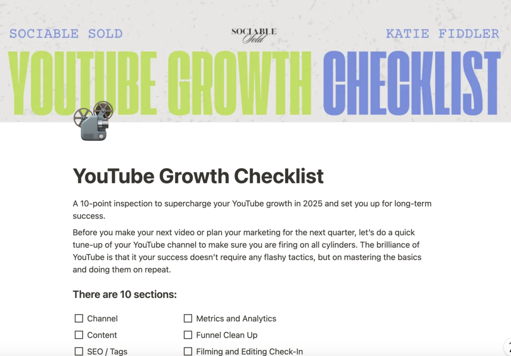 This 10-point checklist can serve as a template for building your first YouTube channel, or as a tune-up for an existing channel. Grab this before you make your next (or first!) video and make sure you have all of the basics covered so you can use YouTube to your advantage in 2025!